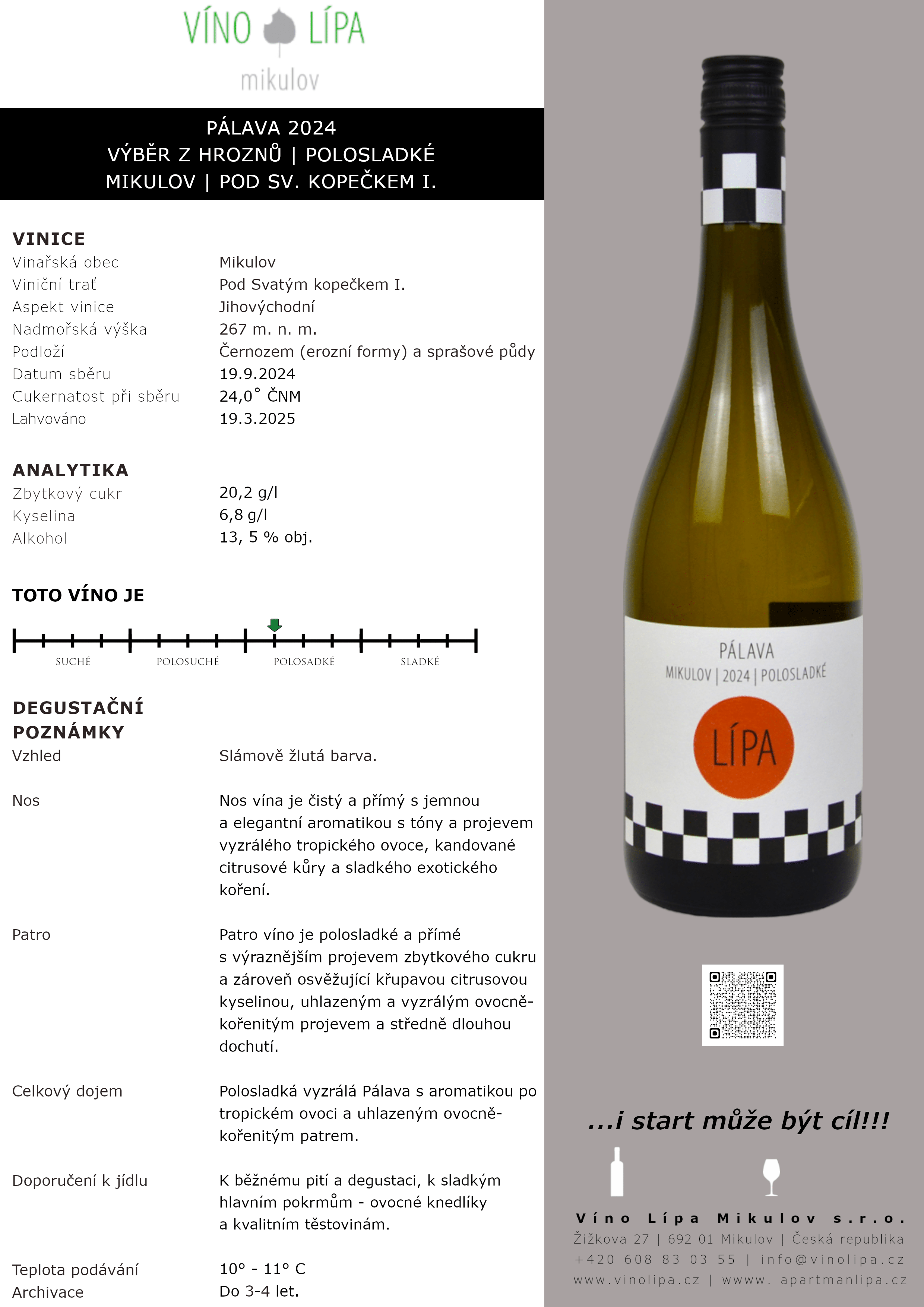 Víno s přívlastkem, Výběr z hroznů, polosladké, 2024, Oblast Morava, Vinařská obec Mikulov, viniční trať Pod Sv. Kopečkem I.