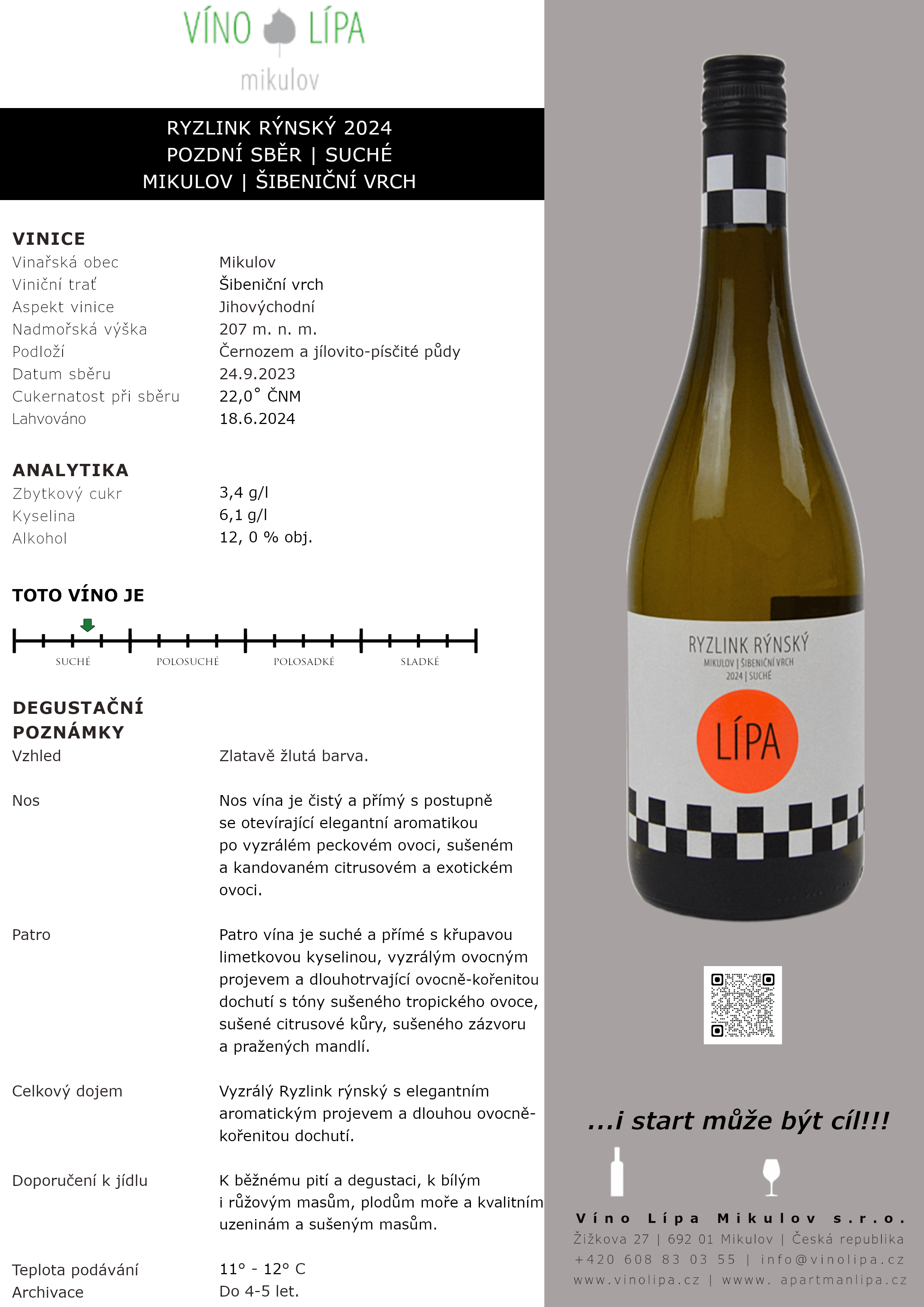 Ryzlink rýnský, pozdní sběr, suché, 2024, Oblast Morava, Vinařská obec Mikulov, viniční trať Šibeniční vrch. Obsahuje Oxid siřičitý.