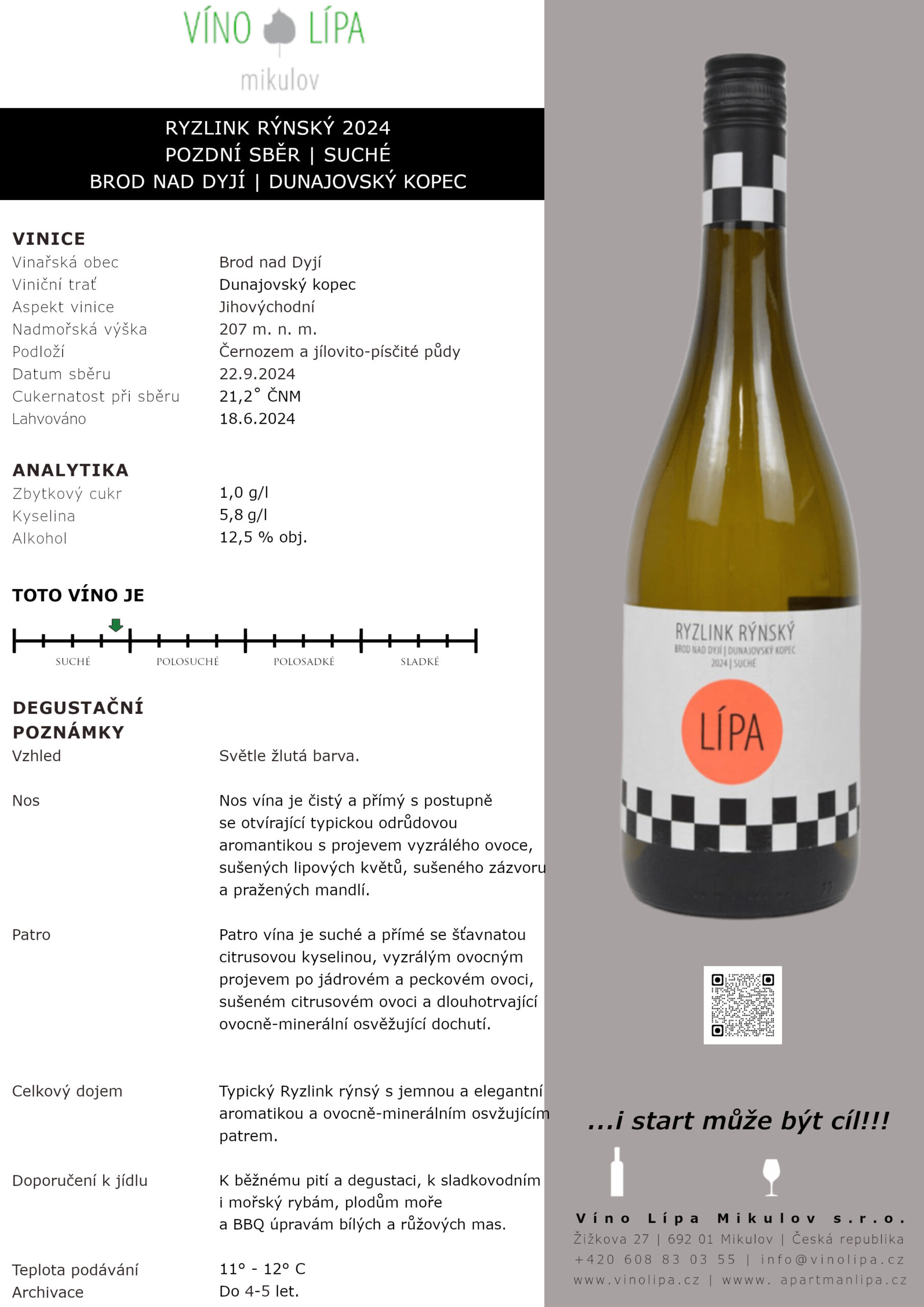 Ryzlink rýnský, Pozdní sběr, Brod nad dyjí, viniční trať Dunajovský kopec, suché, 2024. Obsahuje Oxid siřičitý.