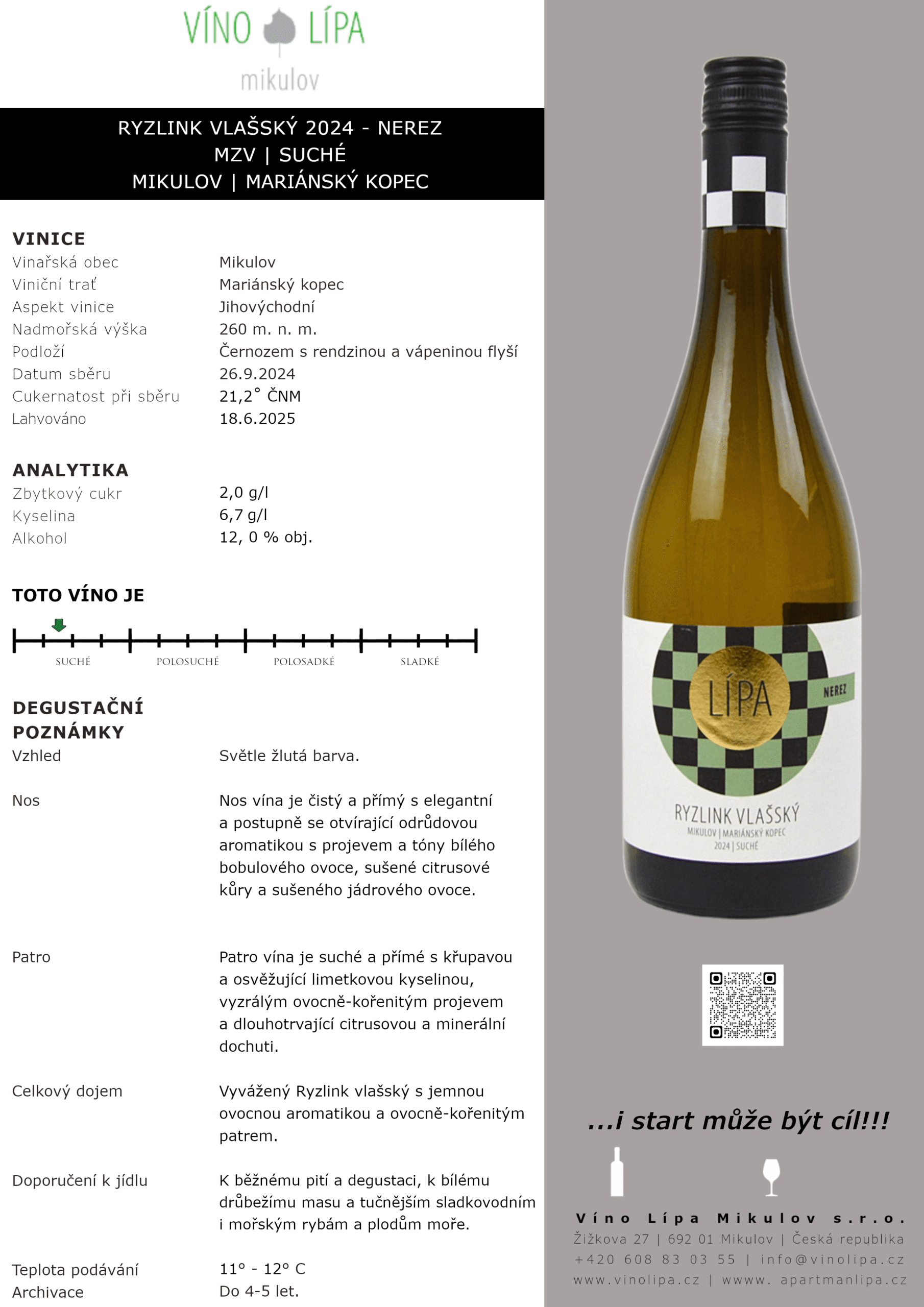 Ryzlink vlašský (nerez), pozdní sběr, suché, 2024, Oblast Morava, Vinařská obec Mikulov, viniční trať Mariánský kopec. Obsahuje Oxid siřičitý.