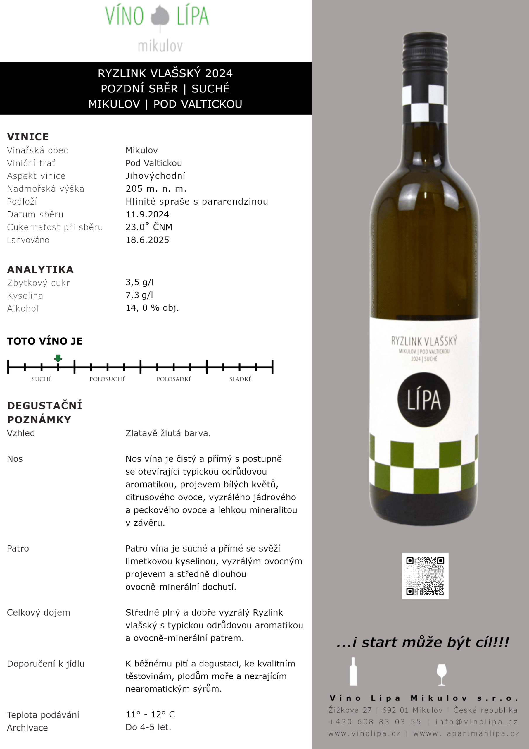 Ryzlink vlašský, pozdní zběr, suché, 2024, Oblast Morava, Vinařská obec Mikulov, viniční trať Pod Valtickou. Obsahuje Oxid siřičitý.